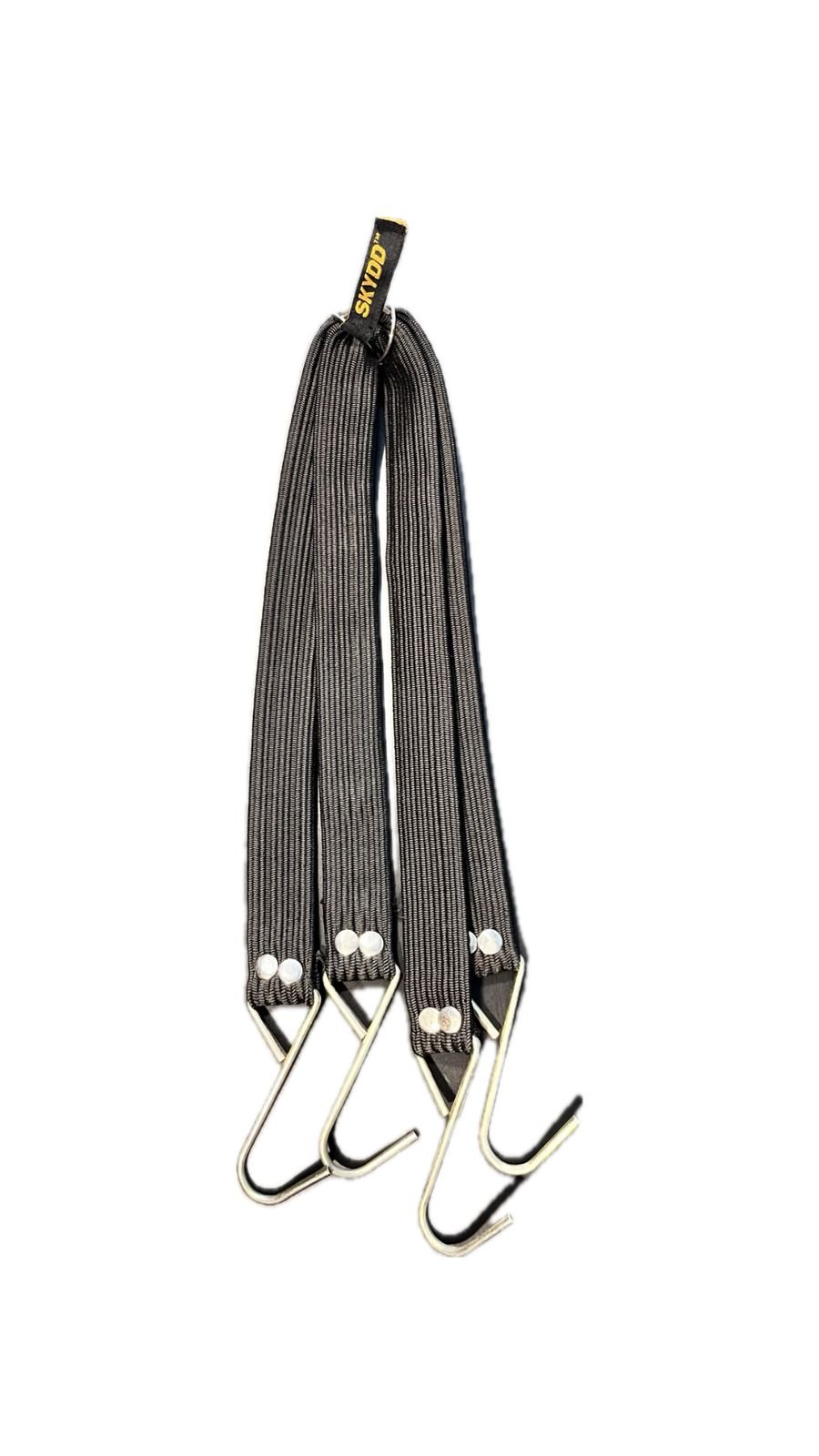 Premium bungee cord with high elastic flat ropes with strong and rust proof hooks. Consists 4 hooks and can be used to carry large luggage on the saddle.